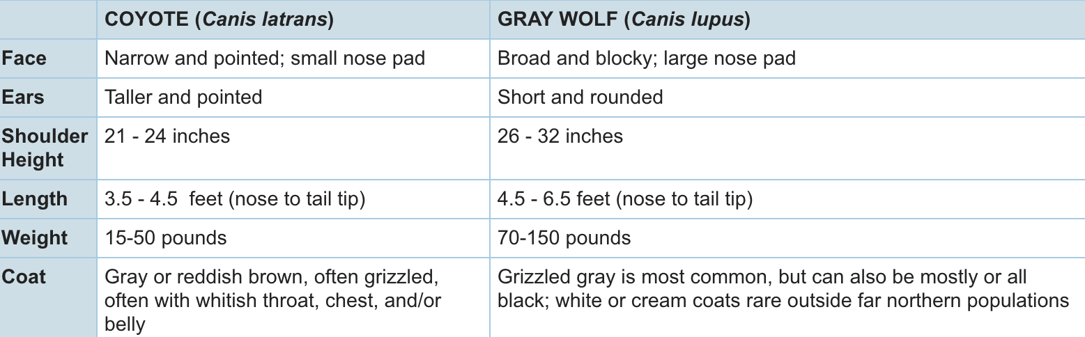 Use this handy chart to distinguish between wolves, coyotes, and dogs, courtesy of the California Department of Fish and Wildlife.